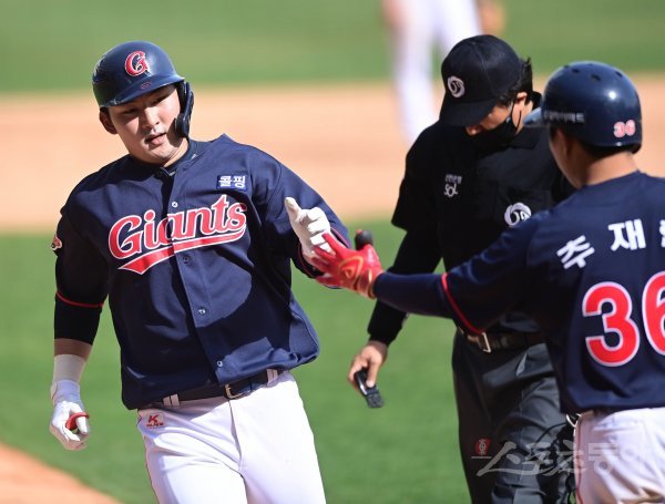 16일 창원NC파크에서 2021 KBO리그 NC 다이노스와 롯데 자이언츠의 연습 경기가 열렸다. 7회초 2사 롯데 김민수가 좌월 솔로 홈런을 쳐낸 뒤 동료의 축하를 받고 있다.