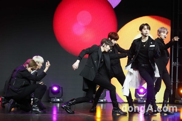 그룹 드리핀이 16일 오후 서울 광진구 예스24라이브홀에서 열린 두 번째 미니앨범 \'어 베러 투모로우(A Better Tomorrow)\' 발매 쇼케이스에 참석해 새로운 무대를 꾸미고 있다. .