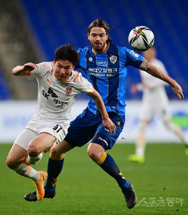 16일 울산문수축구경기장에서 열린 ‘하나원큐 K리그1 2021’ 울산 현대와 제주 유나이티드의 경기에서 울산 불투이스가 제주 이동률에게 반칙을 범하고 있다.