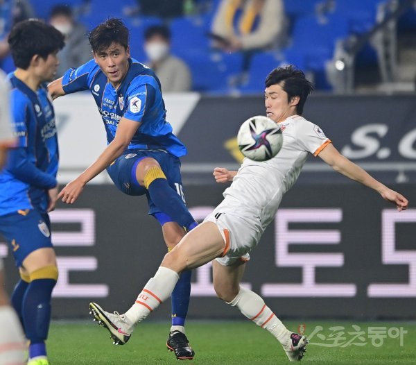 16일 울산문수축구경기장에서 열린 ‘하나원큐 K리그1 2021’ 울산 현대와 제주 유나이티드의 경기에서 울산 원두재가 제주의 수비 앞에서 슈팅을 하고 있다.