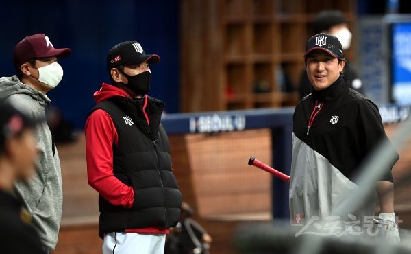 17일 서울 고척스카이돔에서 키움 히어로즈와 kt 위즈의 연습경기가 열린다. 경기 전 키움 홍원기 감독, kt 이강철 감독, 황재균이 이야기를 나누고 있다.