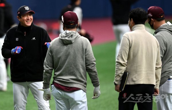 17일 서울 고척스카이돔에서 키움 히어로즈와 kt 위즈의 연습경기가 열린다. 경기 전 kt 유한준이 키움 코치들과 만난 장난을 치고 있다.