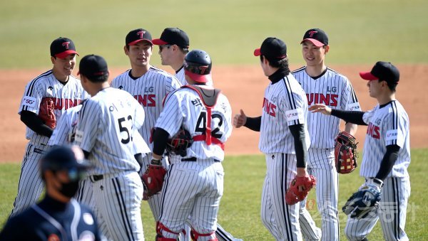 17일 서울 잠실야구장에서 두산 베어스와 LG 트윈스가 연습 경기를 가졌다. 4-0 승리를 거둔 LG 선수들이 하이파이브 하고 있다.