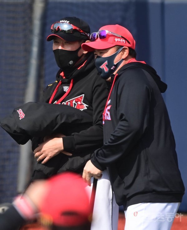 18일 수원KT위즈파크에서 2021 KBO리그 KT 위즈와 KIA 타이거즈의 연습 경기가 열린다. 경기에 앞서 KT 이강철 감독과 KIA 진갑용 코치가 인사를 하고 있다.