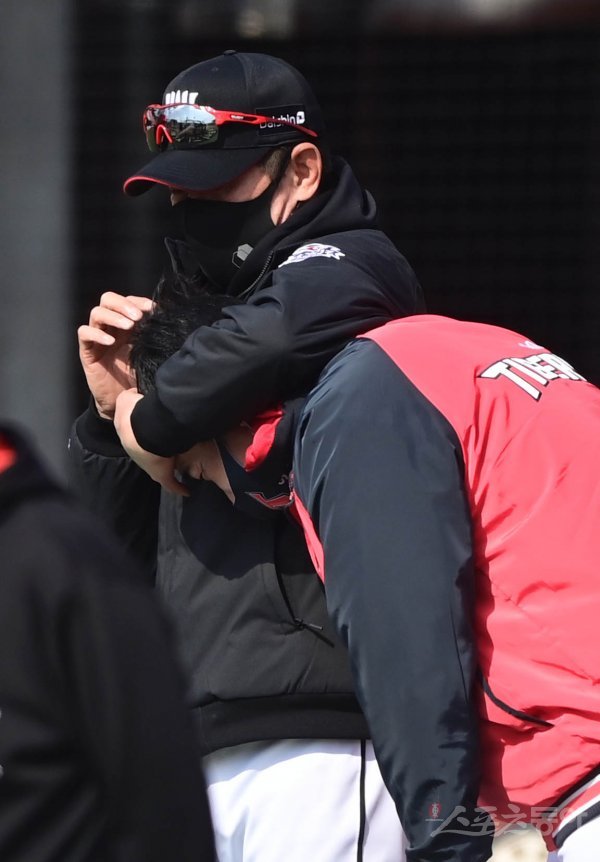 18일 수원KT위즈파크에서 2021 KBO리그 KT 위즈와 KIA 타이거즈의 연습 경기가 열린다. KT 이강철 감독이 KIA 곽정철 코치에게 장난을 치고 있다.
