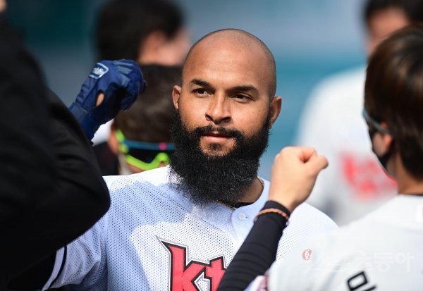 18일 수원KT위즈파크에서 2021 KBO리그 KT 위즈와 KIA 타이거즈의 연습 경기가 열렸다. 6회말 무사 KT 알몬테가 좌월 솔로 홈런을 쳐낸 뒤 더그아웃에서 동료들과 기쁨을 나누고 있다.
