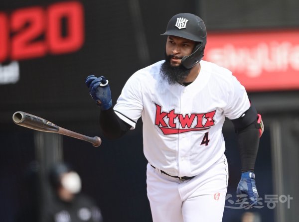 18일 수원KT위즈파크에서 2021 KBO리그 KT 위즈와 KIA 타이거즈의 연습 경기가 열렸다. 6회말 무사 KT 알몬테가 좌월 솔로 홈런을 쳐낸 뒤 배트를 던지고 있다.