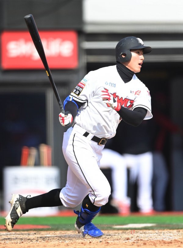 18일 수원KT위즈파크에서 2021 KBO리그 KT 위즈와 KIA 타이거즈의 연습 경기가 열렸다. 8회말 2사 KT 김건형이 안타를 치고 있다.