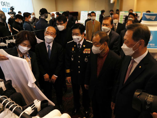 환경부, 국방부, 경찰청 관계자들이 투명 페트병으로 만든 블랙야크 제품을 관람하고 있다.