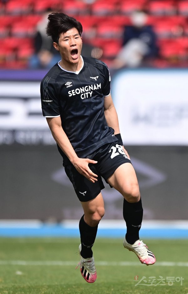 21일 경기도 탄천종합운동장에서 열린 ‘하나원큐 K리그1 2021’ 성남 FC와 포항 스틸러스의 경기에서 성남 박태준이 골문을 벗어나는 슈팅에 아쉬워하고 있다.