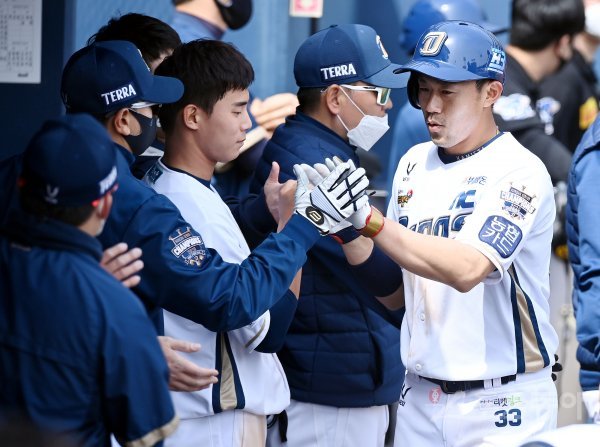 21일 경남 창원NC파크에서 ‘2021 신한은행 SOL KBO리그’ NC 다이노스와 SSG 랜더스의 시범경기가 열렸다. 2회말 2사에서 NC 이명기가 솔로 홈런을 쏘아 올린 뒤 동료들의 환영을 받고 있다.