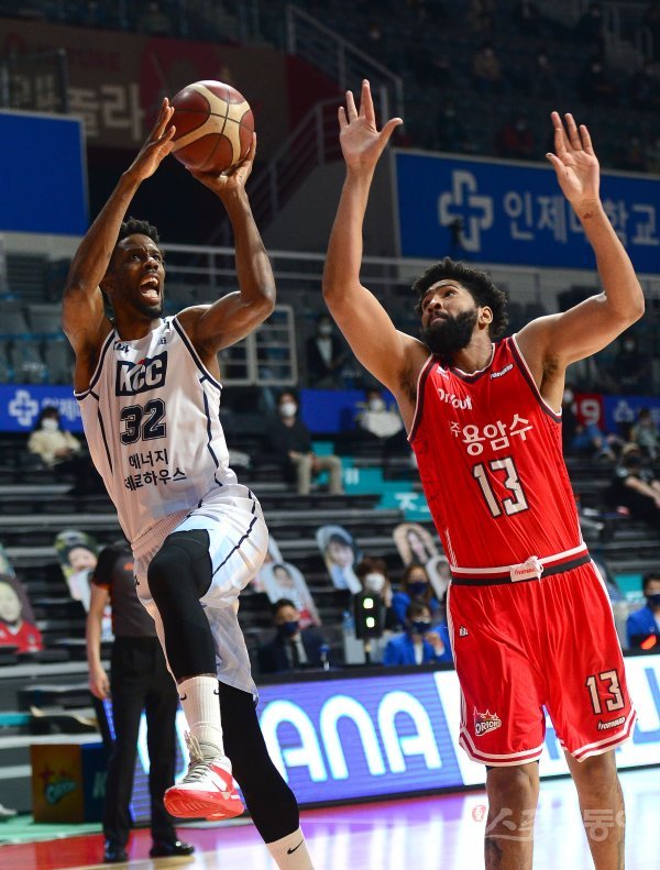 21일 경기도 고양체육관에서 열린 ‘2020-2021 현대모비스 프로농구’ 고양 오리온과 전주 KCC의 경기에서 KCC 헤인즈가 오리온 로슨의 수비를 뚫고 골밑 슛을 하고 있다.