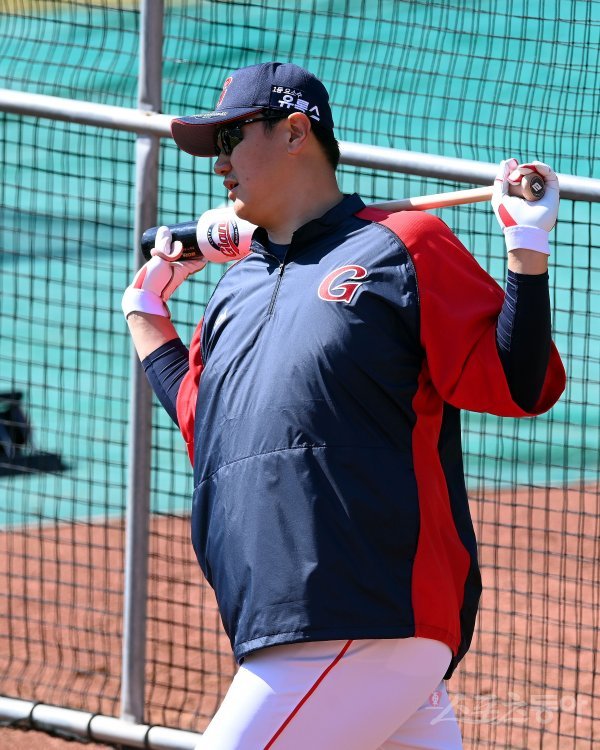 22일 부산 사직야구장에서 ‘2021 신한은행 SOL KBO리그’ 롯데 자이언츠와 SSG 랜더스의 시범경기가 열린다. 경기 전 롯데 이대호가 타격 훈련에 앞서 몸을 풀고 있다.