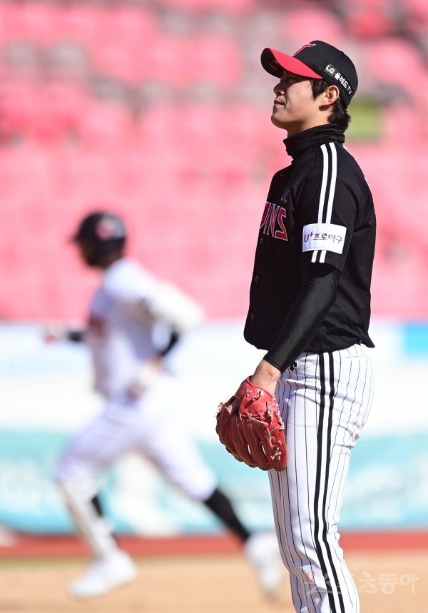 22일 수원KT위즈파크에서 2021 KBO리그 KT 위즈와 LG 트윈스의 시범 경기가 열렸다. 7회말 2사 1루 상황에서 LG 이상규가 투런포를 허용한 뒤 아쉬워하고 있다.