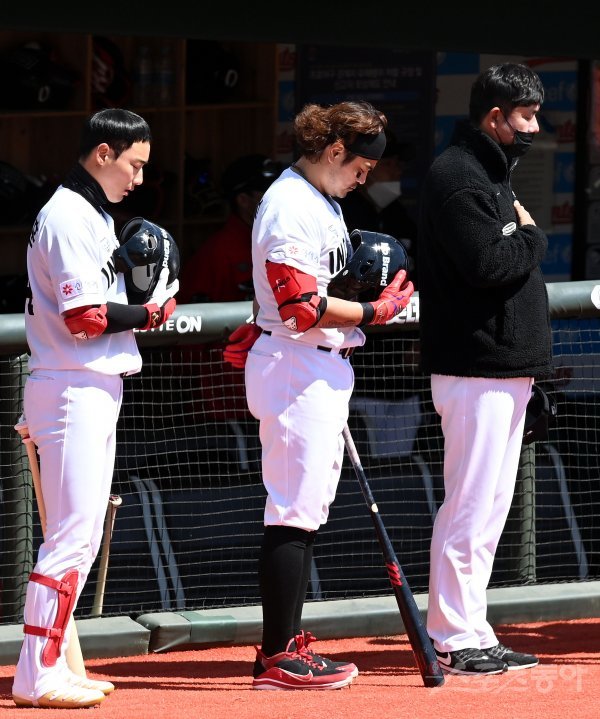 22일 부산 사직야구장에서 ‘2021 신한은행 SOL KBO리그’ 롯데 자이언츠와 SSG 랜더스의 시범경기가 열렸다. SSG 추신수가 경기에 앞서 국기에 대한 경례를 하고 있다.