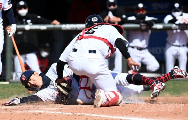 22일 부산 사직야구장에서 ‘2021 신한은행 SOL KBO리그’ 롯데 자이언츠와 SSG 랜더스의 시범경기가 열렸다. 5회말 1사 1, 3루에서 롯데 오윤석 타석 때 이중도루를 시도한 3루 주자 강로한이 홈에서 SSG 이흥련에게 태그 아웃되고 있다.