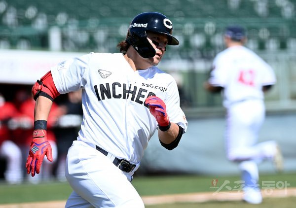 22일 부산 사직야구장에서 ‘2021 신한은행 SOL KBO리그’ 롯데 자이언츠와 SSG 랜더스의 시범경기가 열렸다. 5회초 무사 1루에서 SSG 추신수가 안타를 날린 뒤 1루로 달리고 있다.