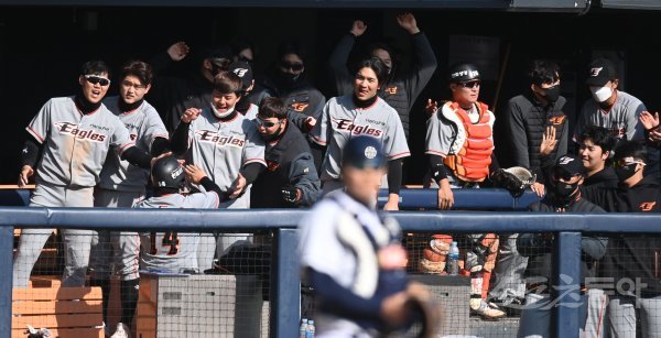 7회초 1사 1,2루 한화 안타 때 2루주자 이도윤이 홈까지 달려 세이프 된 후 더그아웃에서 하이파이브 하고 있다.