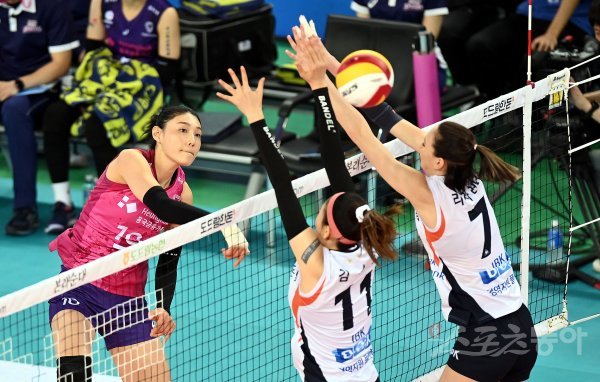 흥국생명 김연경이 IBK기업은행 블로커를 피해 스파이크를 날리고 있다.