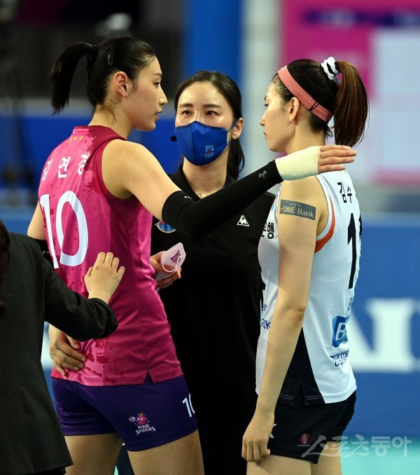 경기 종료 후 흥국생명 김연경이 IBK기업은행 김수지, 김사니 코치와 이야기를 나누고 있다.