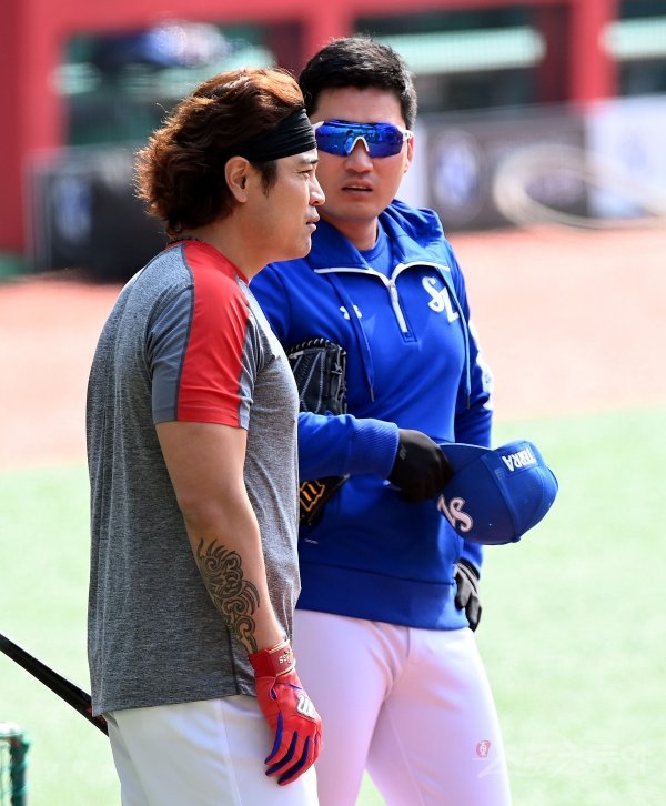 25일 인천 SSG 랜더스필드에서 ‘2021 신한은행 SOL KBO리그’ SSG 랜더스와 삼성 라이온즈의 경기가 열린다. 경기 전 SSG 추신수와 삼성 오승환이 만나 이야기를 나누고 있다.