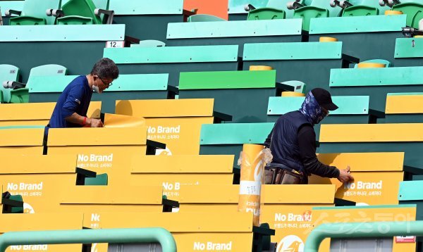25일 인천 SSG 랜더스필드에서 ‘2021 신한은행 SOL KBO리그’ SSG 랜더스와 삼성 라이온즈의 경기가 열린다. 관중석에 이마트 노브랜드 광고를 설치하고 있다.
