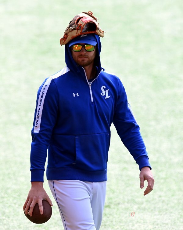 25일 인천 SSG 랜더스필드에서 ‘2021 신한은행 SOL KBO리그’ SSG 랜더스와 삼성 라이온즈의 경기가 열린다. 경기 전 삼성 라이블리가 머리에 글러브를 쓴채 훈련을 준비하고 있다.