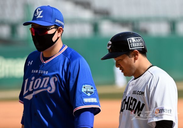 25일 인천 SSG 랜더스필드에서 ‘2021 신한은행 SOL KBO리그’ SSG 랜더스와 삼성 라이온즈의 경기가 열렸다. 4회말 무사에서 볼넷으로 출루한 SSG 최주환이 삼성 오재일과 이야기를 나누고 있다.