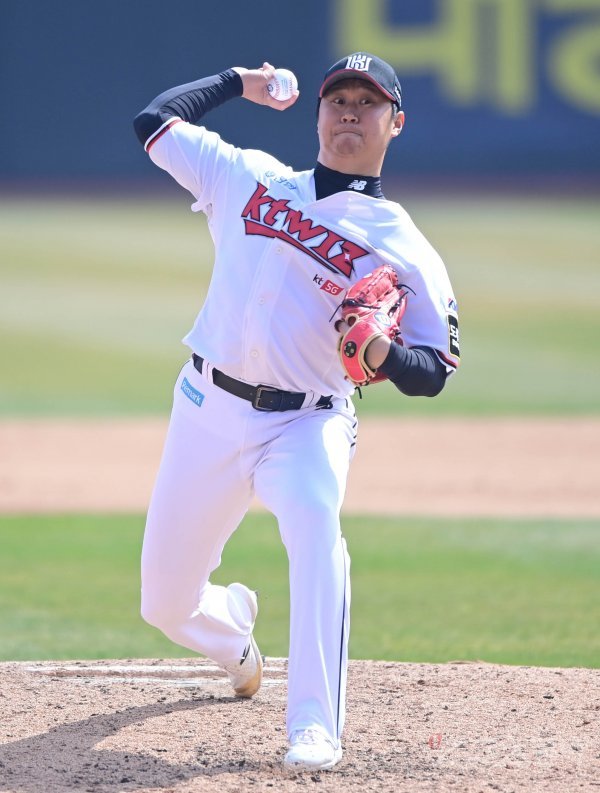 25일 수원KT위즈파크에서 2021 KBO리그 KT 위즈와 한화 이글스의 시범 경기가 열렸다. 5회초 KT 이보근이 마운드에 올라 역투하고 있다.