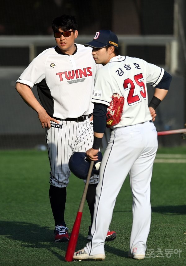 경기 종료 후 LG 유강남과 두산 강승호가 이야기하고 있다.