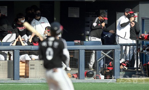 9회초 LG 더그아웃으로 파울볼이 날아오자 선수들이 황급히 피하고 있다.