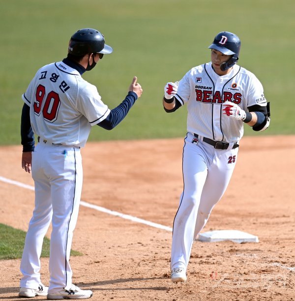 8회말 무사 1루 두산 강승호가 좌월 투런 홈런을 날리고 그라운드를 돌며 하이파이브 하고 있다.