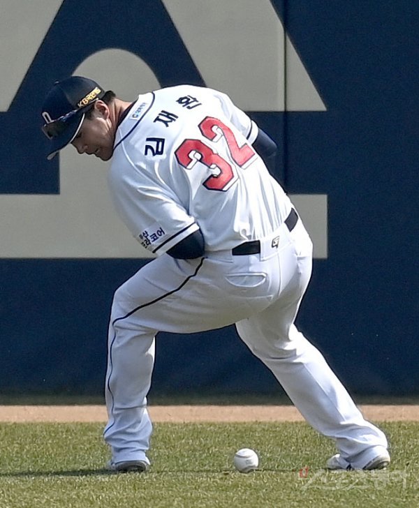 6회초 1사 2,3루 두산 김재환이 타구를 놓친 후 공을 찾고 있다.