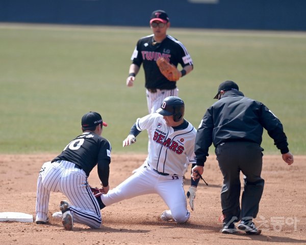 3회말 2사 1루 상황에서 두산 1루주자 허경민이 2루 도루를 시도했으나 아웃되고 있다.