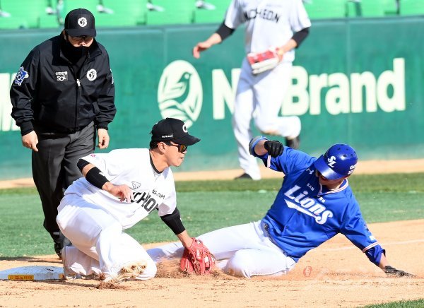 8회초 2사 2루에서 삼성 강한울이 1타점 2루타를 날린 뒤 3루까지 달리다 SSG 정현에게 태그 아웃되고 있다.