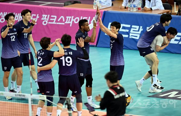대한항공 선수들이 1세트를 승리한 뒤 코트에서 기쁨을 나누고 있다.