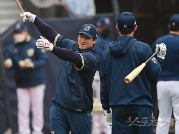 28일 수원KT위즈파크에서 2021 KBO리그 KT 위즈와 NC 다이노스의 시범 경기가 열린다. 경기에 앞서 NC 나성범이 스윙 연습을 하고 있다.