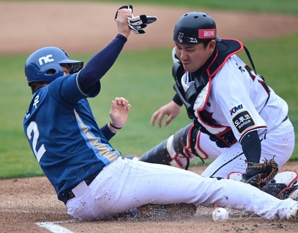 28일 수원KT위즈파크에서 2021 KBO리그 KT 위즈와 NC 다이노스의 시범 경기가 열렸다. 1회초 1사 3루 NC의 희생타 때 3루주자 박민우가 홈으로 파고들어 세이프 되고 있다.