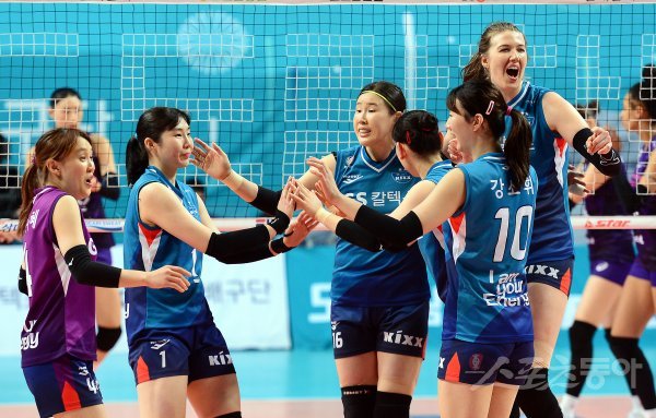 GS칼텍스가 흥국생명에 세트스코어 3-0으로 승리한 뒤 선수들이 코트에서 기쁨을 나누고 있다.