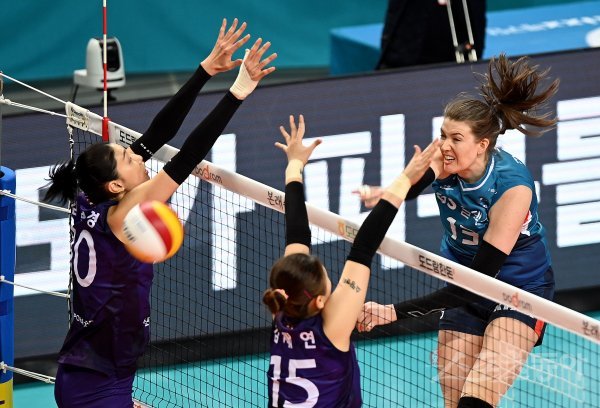 GS칼텍스 러츠가 흥국생명 블로커를 피해 스파이크를 날리고 있다.