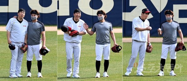 경기 전 LG 김현수와 SSG 추신수가 만나 이야기를 나누고 있다.