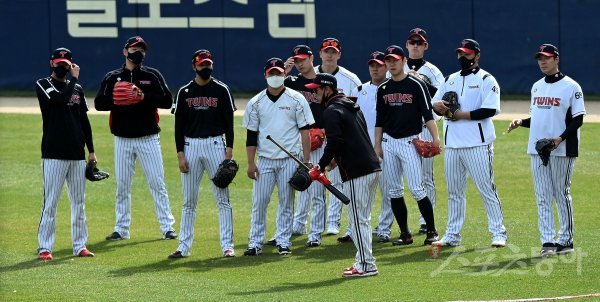 서울을 비롯한 전국 15개 시·도에 황사 위기경보 ‘주의’ 단계가 발령된 가운데 LG 투수들이 마스크를 착용하고 훈련을 하고 있다.