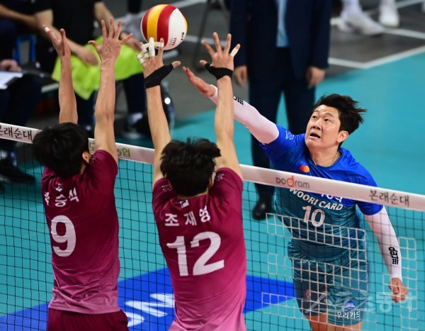 29일 서울 장충체육관에서 ‘2020-2021 도드람 V리그’ 우리카드와 대한항공의 경기에서 우리카드 나경복이 대한항공 블로커의 위로 스파이크를 때리고 있다.