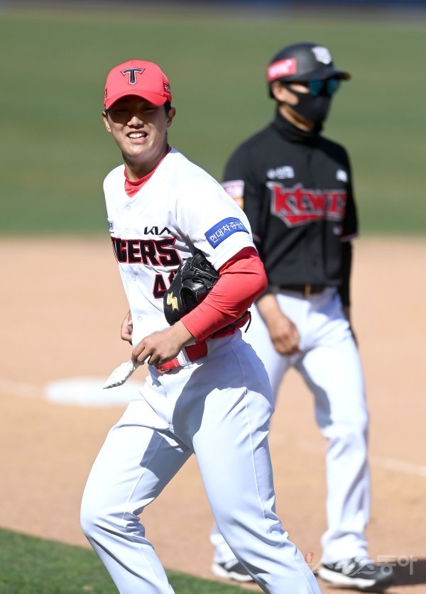 30일 광주KIA챔피언스필드에서 KT 위즈와 KIA 타이거즈의 시범 경기가 열렸다. 교체 등판한 KIA 이의리가 투그를 마치고 더그아웃으로 들어가며 밝게 웃고 있다.