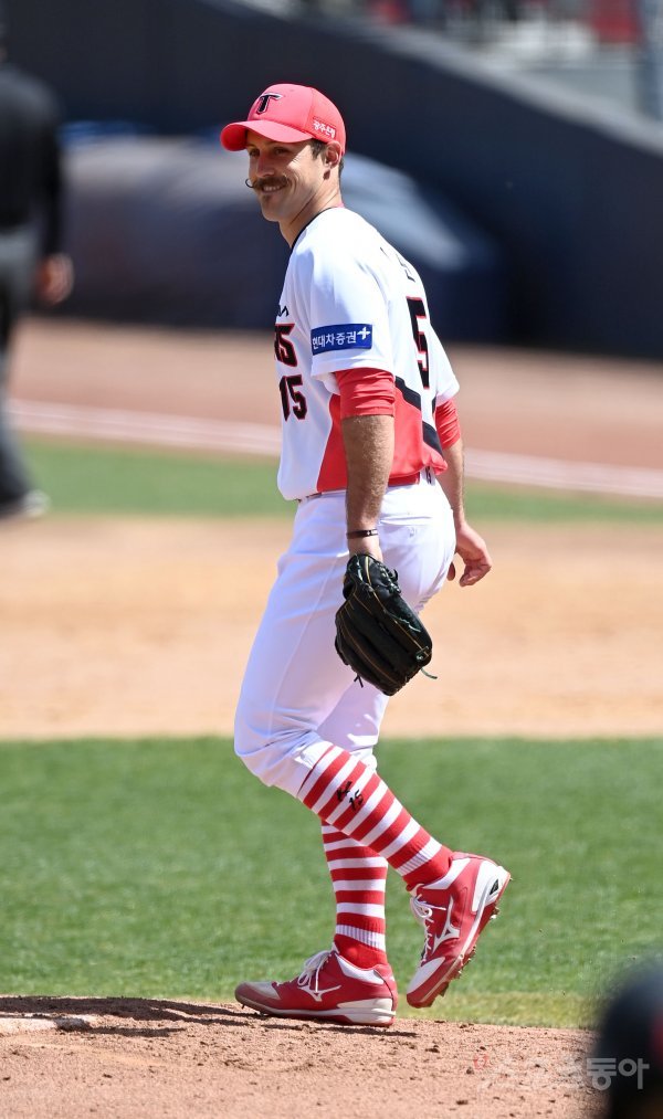 선발 투수로 등판한 KIA 멩덴이 2회초 투구를 마친 후 웃고 있다.