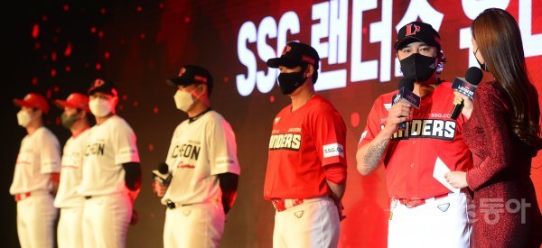 30일 서울 중구 서울웨스틴조선호텔에서 열린 ‘SSG 랜더스 창단식’에서 추신수가 새 유니폼 소감을 밝히고 있다.