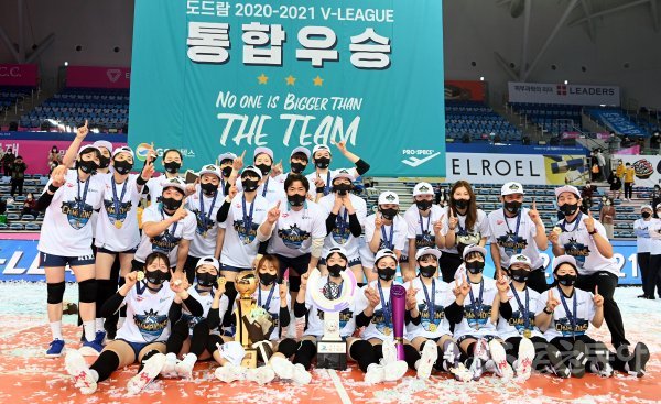 GS칼텍스가 흥국생명을 꺾고 여자배구 최초로 트레블(KOVO컵, 정규리그, 챔프전 우승)을 달성한 뒤 기념촬영을 하고 있다.
