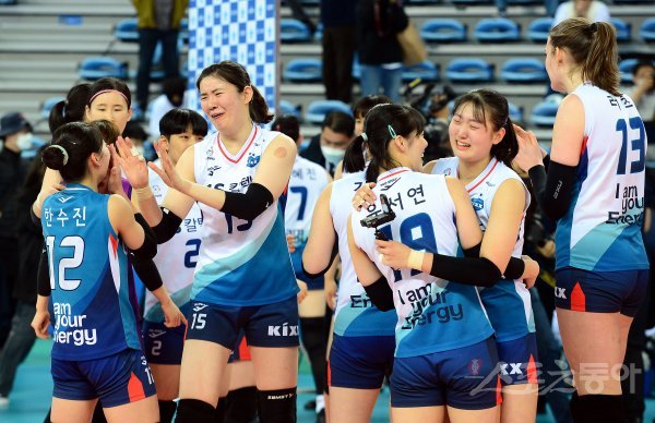 GS칼텍스가 흥국생명을 꺾고 여자배구 최초로 트레블(KOVO컵, 정규리그, 챔프전 우승)을 달성한 뒤 선수들이 코트에서 기쁨을 나누고 있다.