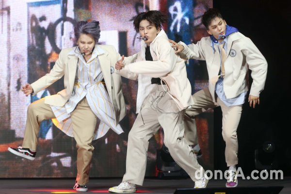 그룹 T1419가 31일 오후 서울 마포구 신한은행 판스퀘어에서 열린 두 번째 싱글앨범 \'BEFORE SUNRISE Part.2\' 쇼케이스에서 새로운 무대를 선보이고 있다.