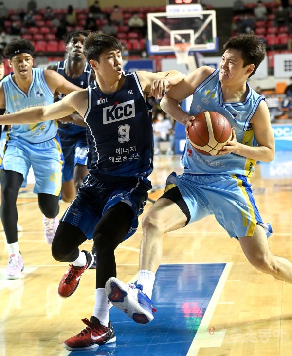 31일 전주체육관에서 열린 ‘2020-2021 현대모비스 프로농구’ 전주 KCC와 서울 삼성 경기에서 삼성 이동엽이 KCC 김지완의 수비를 뚫고 골밑을 공격하고 있다.